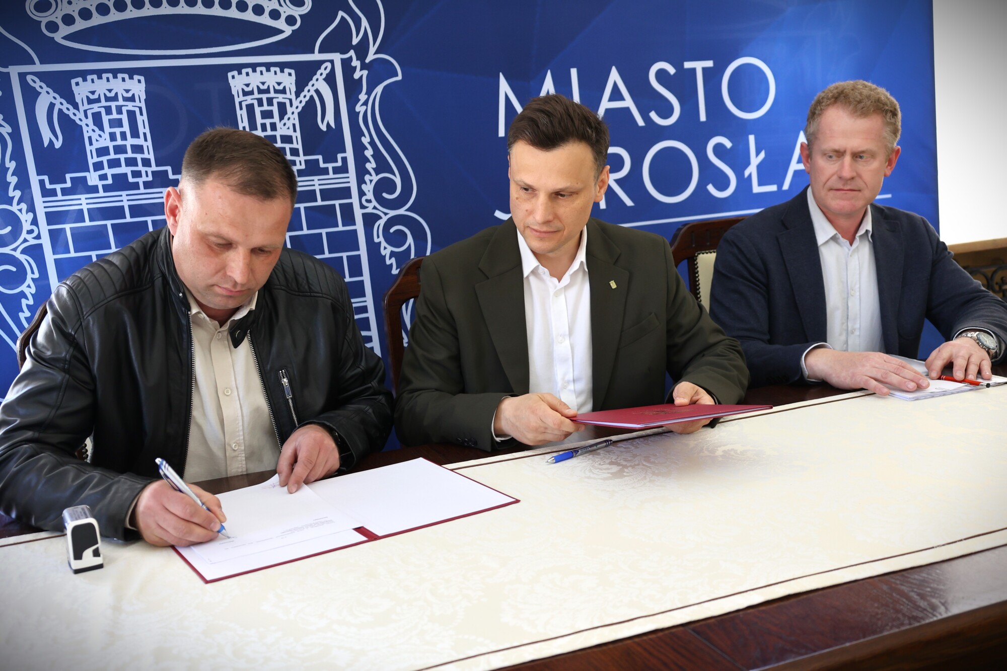 Burmistrz Miasta Jarosławia Marcin Nazarewicz, Dyrektor Wydziału Inwestycji Drogowych Jacek Balawajder i wykonawca inwestycji USŁUGI TRANSPORTOWE Mateusz Sopel