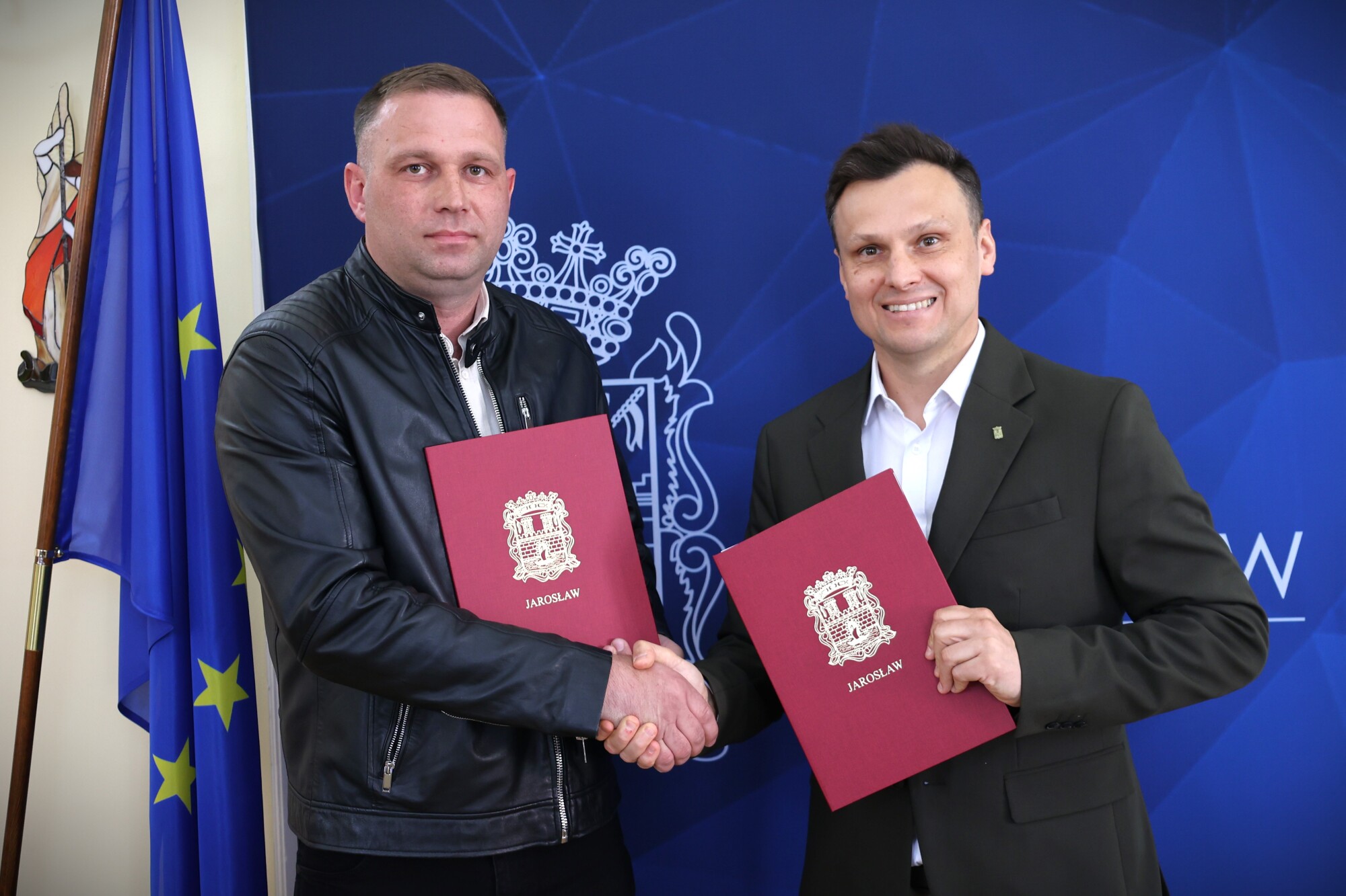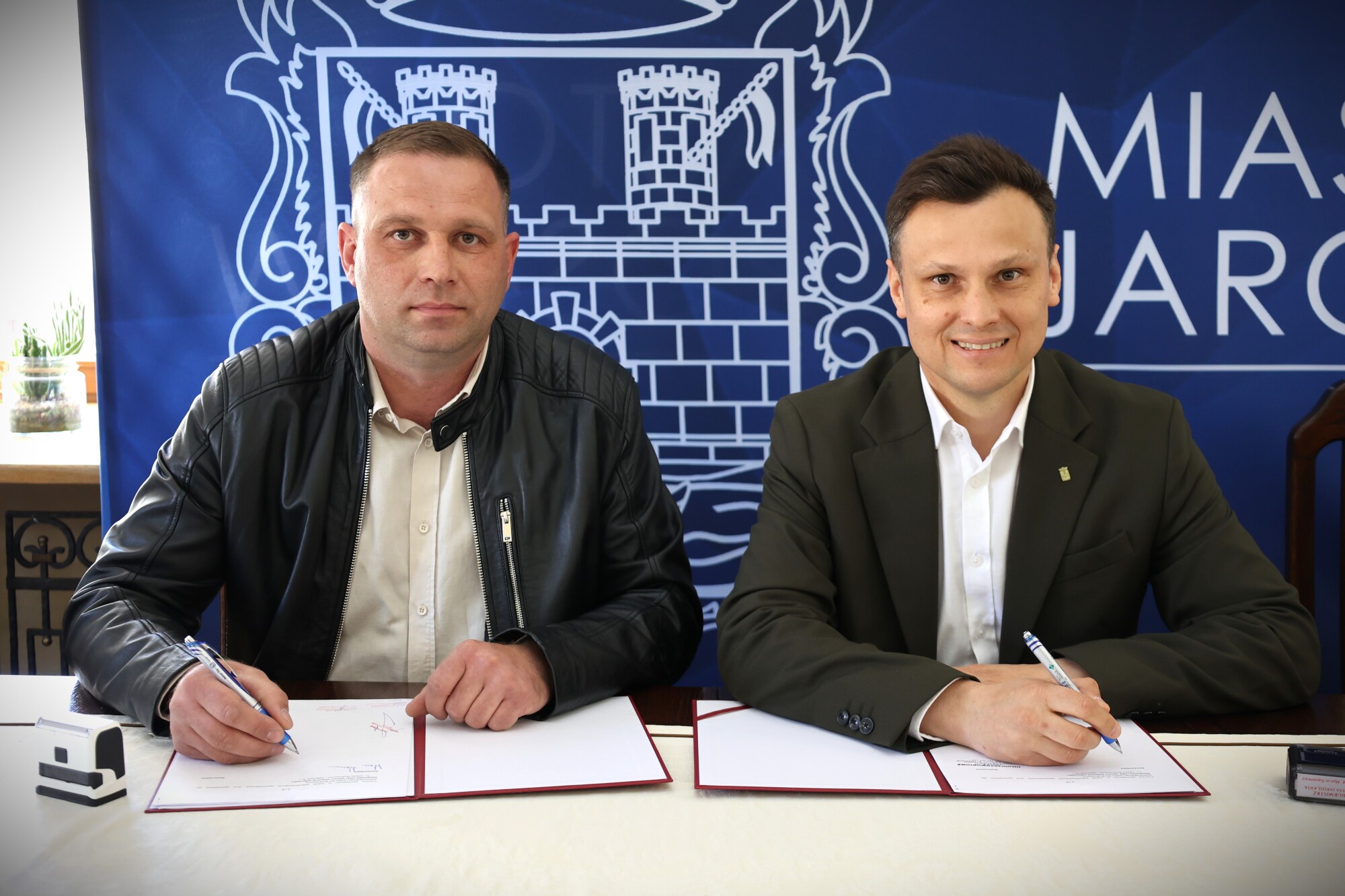 Burmistrz Miasta Jarosławia Marcin Nazarewicz i wykonawca inwestycji USŁUGI TRANSPORTOWE Mateusz Sopel